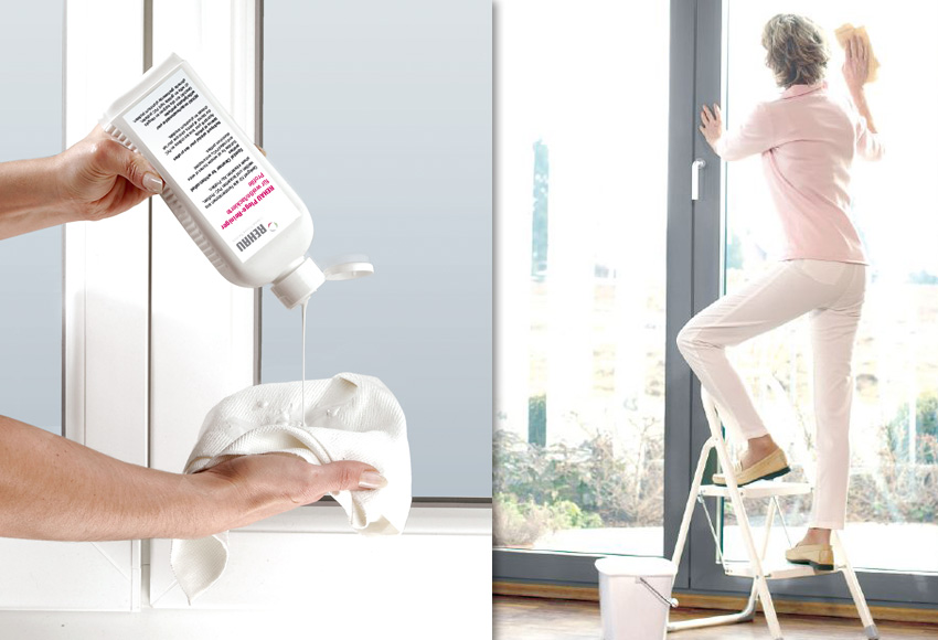Durch Staub oder Regen bedingte Verunreinigungen entfernen Sie einfach mit einem handelsüblichen Spülmittel oder dem REHAU Pflege-Reiniger und einem weichen Tuch.